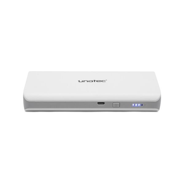 Unotec 31.0085.00.00. Colour of product: Grey, White, Charger compatibility: MP3, MP4, PDA, Portable gaming console, Smartphone, Smartwatch, Tablet. Battery technology: Lithium-Ion (Li-Ion), Battery capacity: 10400 mAh, Charging source: USB. USB input port type: Micro-USB. Width: 14 cm, Depth: 6.2 cm, Height: 2.2 cm