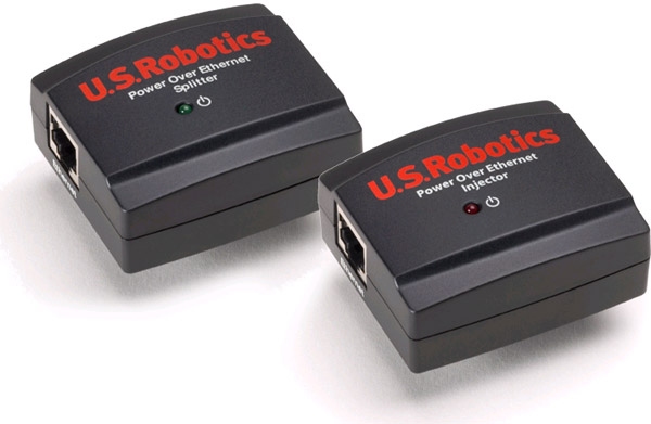 The USRobotics Power over Ethernet (PoE) Kit provides an easy way to power the USR5450 Wireless Turbo Access Point, without adding an additional electrical outlet. Often the best locations for access points to provide optimal coverage for a given wireless implementation are in diffi cult to reach areas, with no obvious need for electrical outlets. Using the PoE Kit allows access points to be placed up to 300 feet away from an electrical outlet, using the Cat 5 Ethernet cable to carry both the data signals and electrical power.