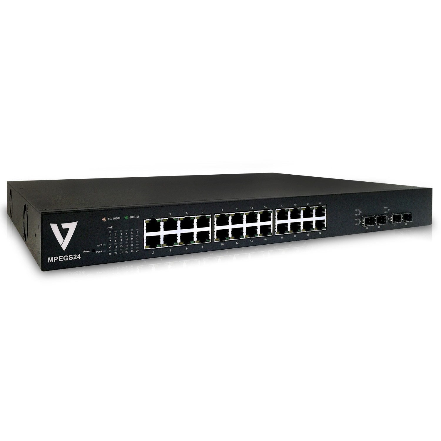 The 24 Port Gigabit +4SFP Port POE Web Smart Ethernet Switch from V7 is designed to maximize system functionality. It features Power Over Ethernet (POE) ports that automatically detect and supply power with those 802.3at compliant Powered Devices (PDs) such as wireless access points or IP-based network surveillance cameras. Manage and configure the switch through the web interface for an optimized network, and the switch also comes equipped with 4 combo SFP slots, expanding your network flexibility. Additionally the switch is rack mountable and comes with a mounting kit for fast and easy deployment. With all these advanced features, the 24 Port Gigabit Smart PoE Switch is the smart choice for business networking.