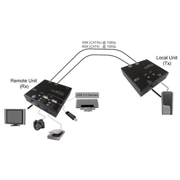 <ul><li>KVM extension over up to 60 m through the Cat.6 connection</li><li>Supports HDMI with high resolution video up to 1920 x 1080 (Full HD)</li><li>Supports USB PC or KVM switch</li><li>Ideal for professional video applications</li><li><b>HDCP-compliant</b></li><li>No drivers needed or software required</li><li>Stable, metal housing</li><li>Power supplied</li><li>Receiver (RX) unit connectors: Monitor: 1x HDMI; 4x USB type A F; 1x Mini USB 5-pin F, 2x RJ45</li><li>Transmitter (TX) unit connectors: Monitor: 1x HDMI; 2x Mini USB 5-pin F; 2x RJ45</li><li>Contents: Transmitter unit, receiver unit, 2x power supply, manual</li></ul>.