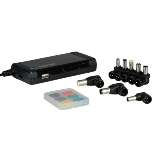 Contents: Adapter with different notebook adapter plugs, colour encoded adapters for output voltage control, power cord, manual