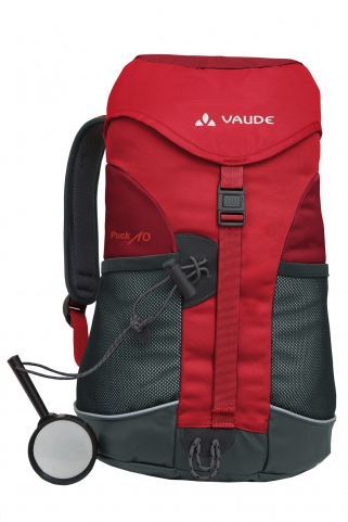 Puck 10, 10 l, salsa/red The outdoor specialist backpack for kids! This namesake of the friendly forest sprite Puck was developed specifically for trips over hill and dale. It's rugged, has a waterproof floor, a seat pad and a raincover, plus it has a magnifying glass attached to the side pocket for observing insects. What better backpack for children who love to explore nature or attend a forest kindergarten. Side mesh pockets, a top lid compartment and inner pockets store provisions, a change of clothes and small items. The Puck 10 can also be used as a small hiking backpack thanks to the gear loops and hydration system port. This kids' favorite from VAUDE comes in a wide range of cheerful colors.