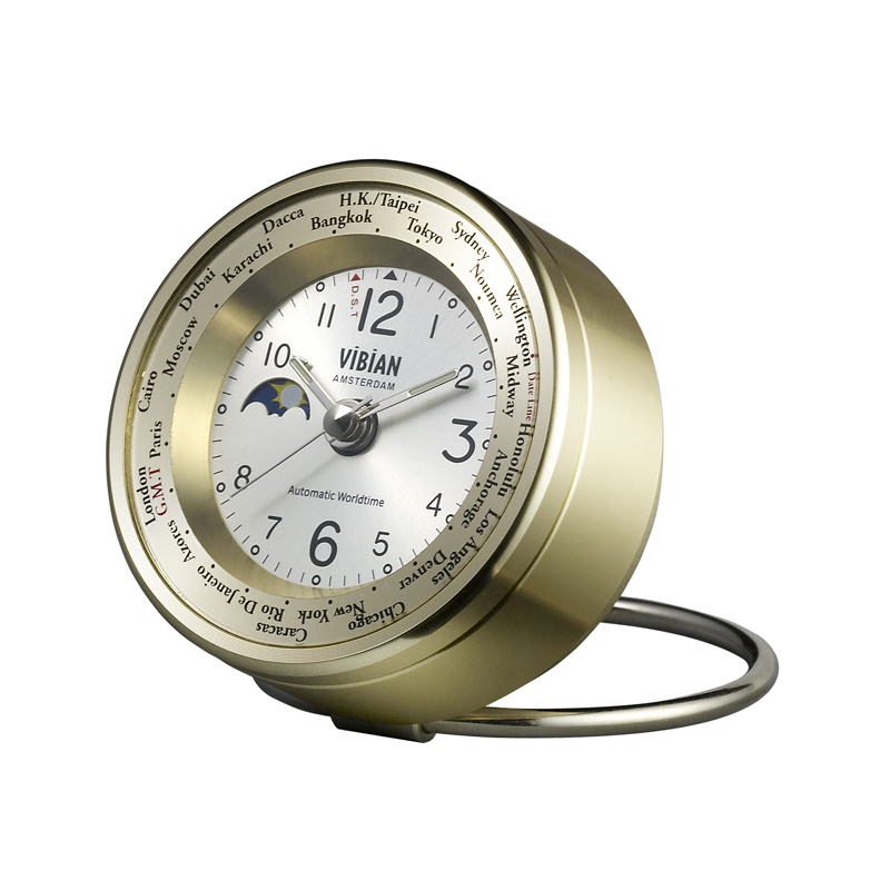 Clean shaped clock with adjustable metal stand. Just rotate the city bezel anti clockwise to show any global time zone. Multistage pre-set alarm for local and other global time zones. The dial has a pleasant readability.