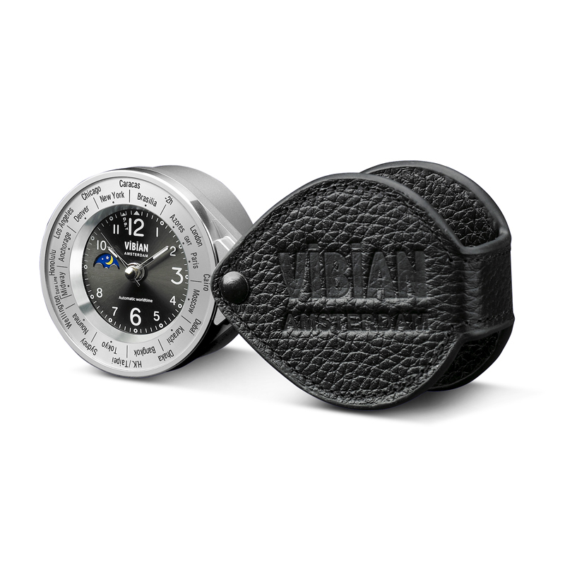 This clock designed by VIBIAN® in Amsterdam, the Netherlands, contains a supreme technology. It has a precise Global Time Zone mechanism. You can select all 24 Global Time Zones with a single movement ! By simply turning the bezel to a city, the hands (that display the time) will move to that respective time zone. Besides that, the course of the sun and moon are shown and summer and winter time are taken into consideration. This direct adjustment to each Global Time Zone is unique and it will enable you to follow The Rhythm of Time. Wherever you are in the world, you will always know the right time.