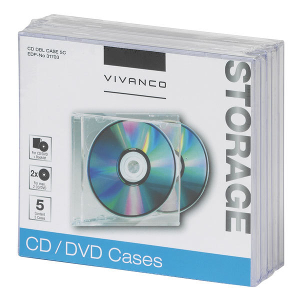 Vivanco 31703. Case type: Jewel, Colour of product: Transparent, CD capacity: 2 discs. Width: 12.4 cm, Depth: 15.2 cm, Height: 4.7 cm. Number of products included: 5 pc(s)