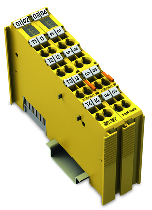 The 750-665/000-001 PROFIsafe Input/Output Module has 4 power outputs (O1 ... O4) and 4 clock sensitive inputs (I1 ... I4) that are fed by 4 differently clocked outputs (T1 ... T4).