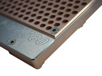All water carrying parts of the cooler are made from pure electrolytic copper or stainless steel, and the connection block is made from black POM. The top is protected against staining by a special clear varnish. The top is protected against staining by a special clear varnish. The top is protected against staining by a special clear varnish. The design of the “Hole Edition” features a perforated cover plate.