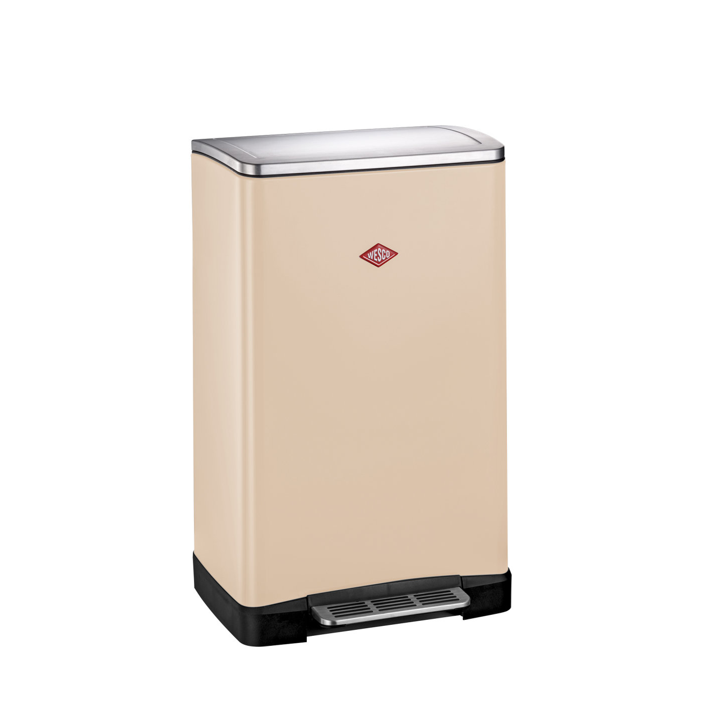 The household waste separator from WESCO. Two 18-litre plastic inserts tidily separate paper, glass, plastic or other waste. Thanks to the integrated damper, the stainless steel lid closes almost soundlessly and can be held in the open position. A practical facility for attaching bin liners to the plastic inserts prevents the bags from slipping. The large stainless steel pedal guarantees easy operation.
