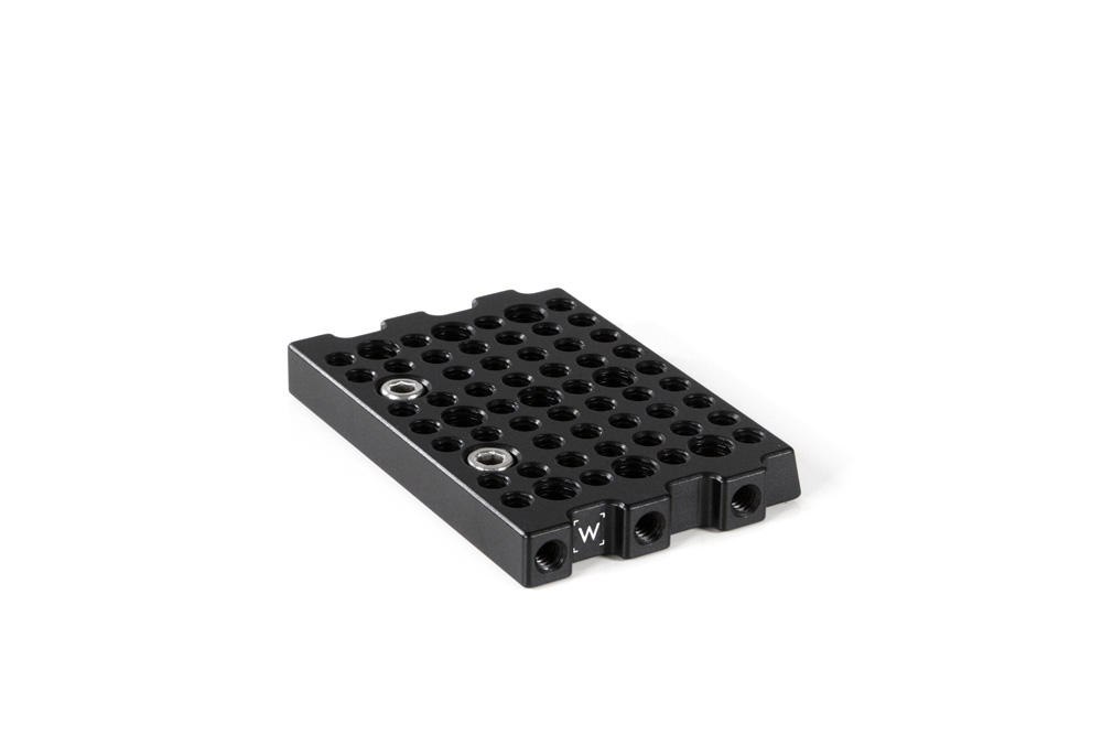 Top plate for RED Dual Battery Module. Arrays of 1/4-20 holes in Red spacing. Multiple 3/8-16 holes for large accessories. Contours to the shape of module.