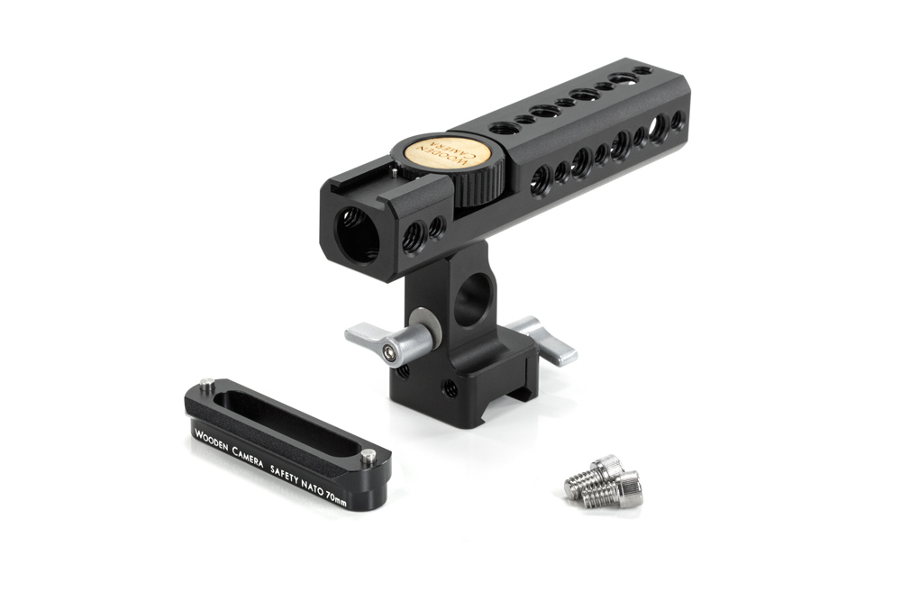 The NATO Handle Kit (Plus, 70mm) is a quick release top handle that attaches and detaches without screws. Includes NATO Handle (Plus) and Safety NATO Rail (70mm) at a reduced package price. To attach to camera, slide onto NATO rail and turn thumbscrew to lock in place. Loosen top knob to adjust grip rotation. Sideways 15mm tube clamp allows for attachment of UVF Mount v2 (No Clamp). Forward facing 15mm rod opening and 19mm rear rod opening for attaching single rods for focus motors, etc. Integrated shoe mount for attaching on camera lights, microphone shock mounts, etc. 1/4-20 and 3/8-16 holes on grip area for attaching additional accessories. 1/4-20 holes on handle front for attaching Rod Clamps which allow for pass through rods front to back.
