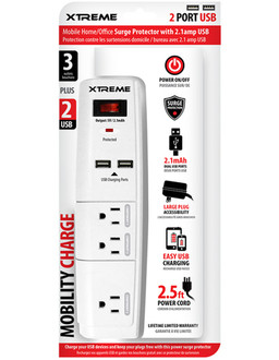 3 Outlet Surge with 2 USB Ports - Features 3 grounded 3-pronged wall outlets
