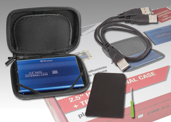 External case to house a 2.5” HD. The package contains the USB-USB cable, fixing screws, a mini-screwdriver and a soft pouch made of leatherette. Available in various colors.