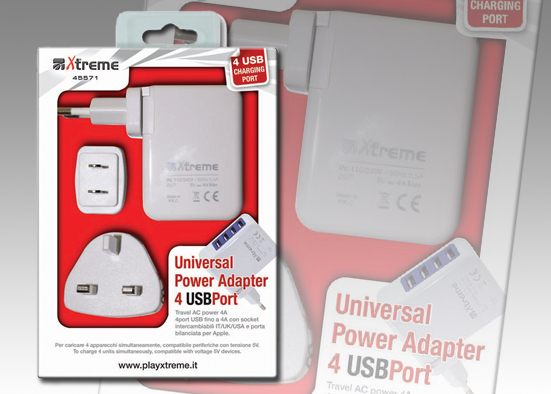 Useful universal travel power supply equipped 110/240v compatible with all devices 5V voltage. Provided with interchangeable connectors IT/UK/USA with 4 USB ports, balanced outputs for Apple devices, lets you upload 4 devices simoultaneusly. The package doesn't contain any cables.