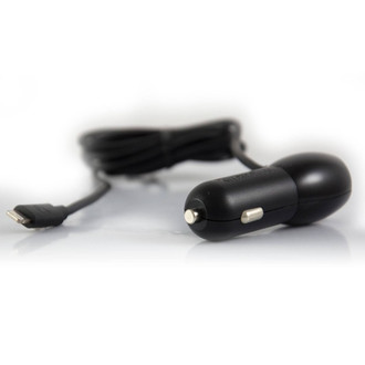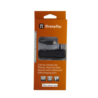 2.4 amp car charger includes tethered 1 meter Lightning cable with 1.0 amp USB charging port for an additional device.