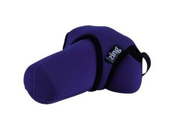 Zoom SLR Camera Cover, blue The original, patented Zing design. One-piece, wrap-around cover stretches over lens and self-secures without buckles,snaps or zippers. Removable retainer strap clips onto camera strap and allows cover to hang out of the way while shooting.