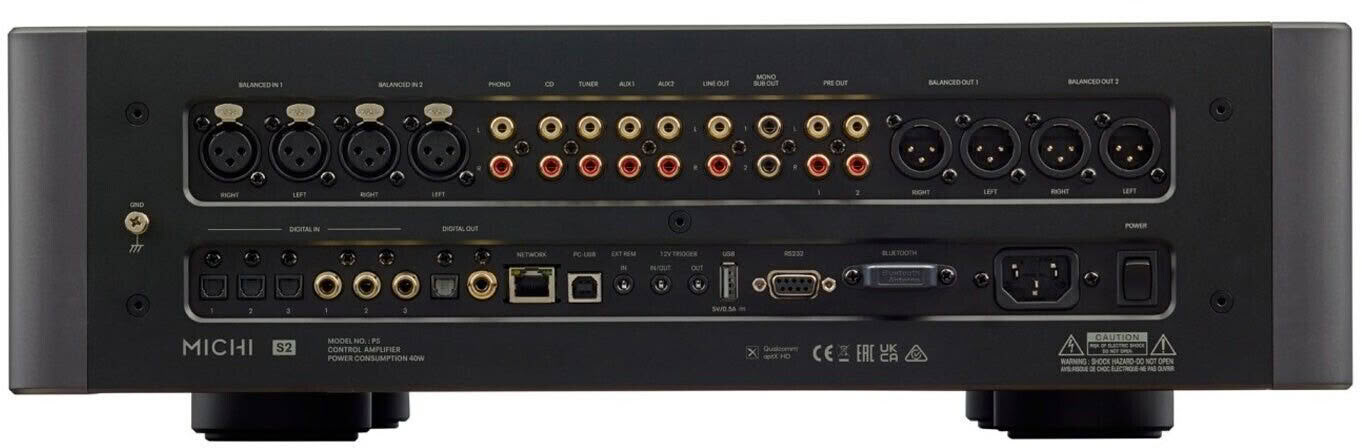 Предусилительные выходы: 2x сабвуфер (Cinch/RCA, моно), 2x выход предусилителя (Cinch/RCA, стерео)