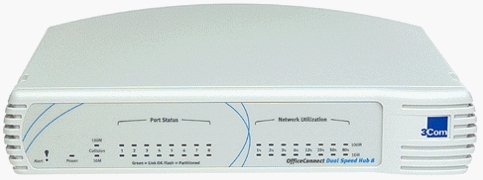 The OfficeConnect Dual Speed Hub 8 is an easy-to-use Class II hub (repeater) with eight 10/100BASE-TX ports. It allows you to set up a network with both Ethernet (10Mbps) and Fast Ethernet (100Mbps) workstations and other devices (a Class II hub can be connected to another Fast
