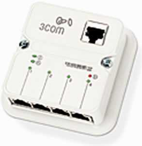 The 3Com® IntelliJack™ Switch is available as a managed device adapted to UK and EU wall outlet standards. All versions of this "in the wall" solution mount in BSI- or DIN-standard wall cutouts for a fraction of what it costs to run Category 5 or 5e cabling.