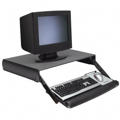The adjustable keyboard management solution where there is no space under the work surface. Great for laboratories or settings where workstations are frequently moved around. Desktop design provides height and tilt adjustment up to 3¾" below desk level. Wide platform places mouse next to keyboard for added comfort. Leatherette gel wrist rest is easy to keep clean. Easy to use and had great stability. Steel reinforced construction. No installation required. Accepts keyboards with maximum height of 1½".