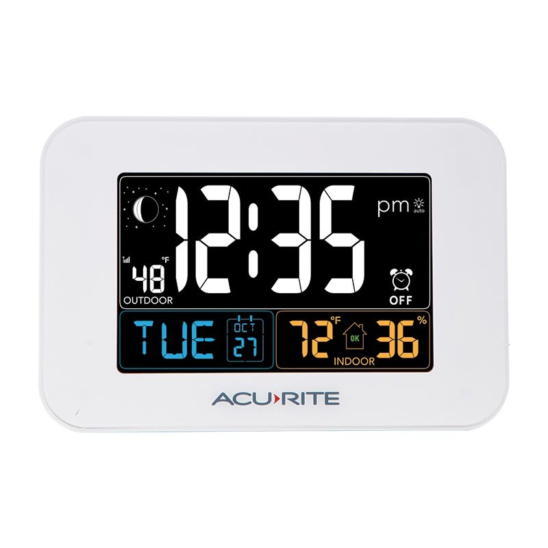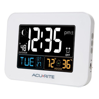 Wake up to a fully-charged phone and a view of current outdoor conditions. The AcuRite Intelli-Time Alarm Clock features an illuminated color display with indoor and outdoor temperature, Intelli-Time clock, the date and day of the week, and moon phase. Offers the convenience of USB charging for compatible smartphones. Intelli-Time clock automatically updates itself for Daylight Saving Time. The wireless sensor includes a built-in thermometer that measures the outdoor temperature, and features weather-resistant construction and an integrated hanger for easy mounting. One-year limited warranty. It's more than accurate, it's AcuRite.