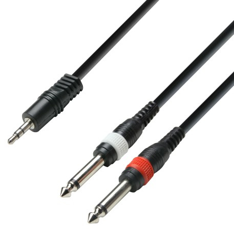 Audio Cable 3.5mm Jack stereo to 2x 6.3mm Jack mono 3m Counterpart of the K3YWCC adapter cable, this time from 3.5 millimetre mini TRS plug to 2x 6.3 millimetre TRS plug. For connecting external signal sources, for example, MP3 players or PC sound cards.