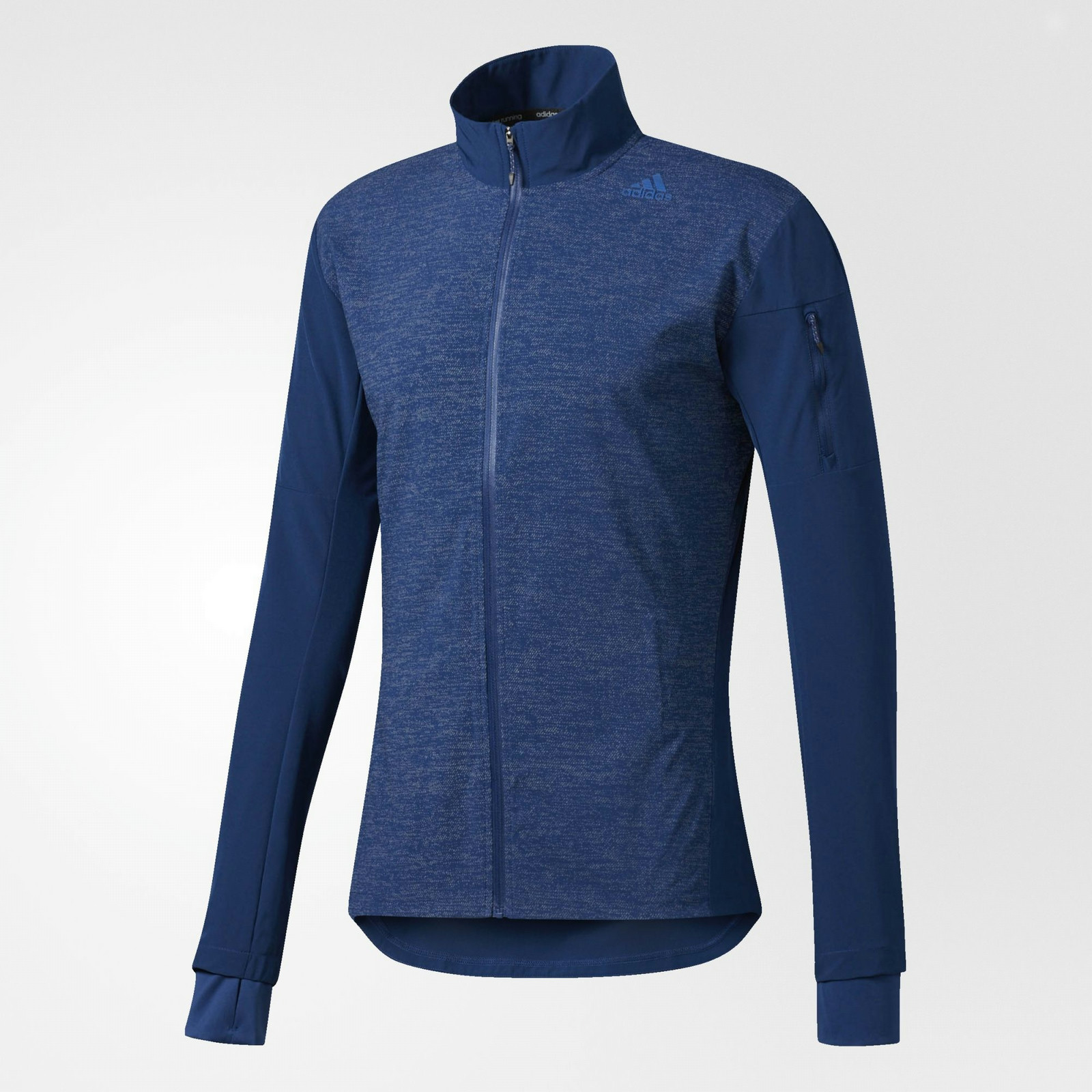This men's jacket keeps you warm and dry so you can take on the chill of an early-morning run. Made of moisture-wicking fabric, the jacket gives you quick-dry comfort as you work up a sweat. The full-zip front and stand-up collar provides adjustable coverage on the go and the thumb holes add extra warmth. A zip sweat-guard pocket helps keep small items dry and close.