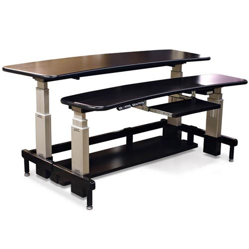 The Dual Tier cart is ideal for professionals who require two independently adjustable surfaces to perform their tasks. At the touch of a button, the Dual Tier lets you adjust the surface height to be raised and lowered within a range of 28"-47"from the floor, for sit-to-stand work positions that accommodate virtually any user. The standard curved shape with bumper trim molding is available with a full range of accessories to ensure comfort and convenience. Also attached is a retractable keyboard and mouse tray. A bottom shelf accommodates our storage and other equipment if needed. The cart stands on four 4" glides. All carts are built with 11-gauge steel frames with epoxy coated finish for strength and durability. The work surfaces are made with high-pressure scratch resistant laminates. Dimensions are 72"W x 44"D displayed in Black optional colors are available. The ergonomic features of the Ergo Tier Cart are designed to reduce the risk of musculoskeletal injury and eye strain and adapt to every user. This flexible cart shown is our standard shape table. In its bifocal position, the monitors are lower than the work surface, ensuring a comfortable viewing angle. This flexibility delivers optimum body positioning and comfort with preset digital readouts for each surface. Limited five year warrant except for electronics and motors which are covered for one year as are Lights and illuminators.