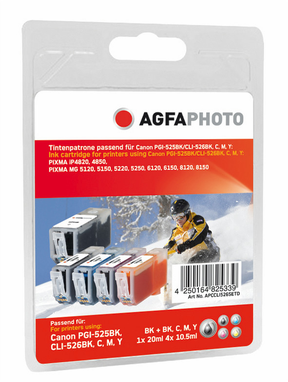 AgfaPhoto APCCLI526SETD. Printing colours: Black, Cyan, Magenta, Yellow, Compatible products: - Canon Pixma IP 4850 - Canon Pixma MG 5250 - Canon Pixma MG 8150 - Canon Pixma IP 4950 , Package type: Blister