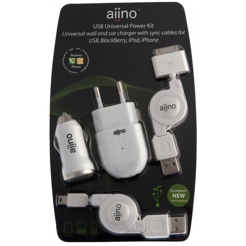 Aiino AIUSB-K. Charger type: Auto, Indoor, Charger compatibility: Digital camera, GPS, Mobile phone, MP3, Tablet, Power source type: AC, Cigar lighter. Colour of product: White