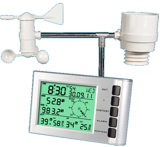 测量功能 Indoor barometer, Indoor thermometer, Rain sensor, Wind direction, Outdoor thermometer, Anemometer (wind speed), Outdoor barometer