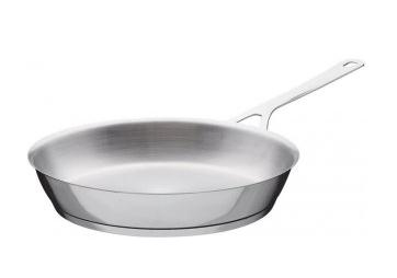 Frying pan in 18/10 stainless steel mirror polished. Suitable for cooking with induction, gas, electric hob, ceramic glass hotplate and in the oven. Dishwasher safe. The third series of Alessi pots had the ambitious goal of standing beside Sapper's copper and steel “Cintura di Orione” and also Giovannoni's aluminium-bottomed steel “Mami”, but occupying a much lower price bracket yet maintaining the same high design quality and high attention to functionality. Jasper Morrison took up the challenge of representing “potness” by developing his rigorous, linear and detailed style (for example the flared edge for pouring, the graduated scale inside the pots, the cover knob that lets you lift it with a wooden spoon) to produce something of a masterpiece in Super & Popular design.
