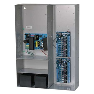 This unit distributes and switches power to access control systems and accessories. It converts a 115VAC 60Hz input into sixteen (16) independently controlled 24VDC PTC protected outputs. Outputs are activated by an open collector sink or normally open (NO) dry trigger input from an Access Control System, Card Reader, Keypad, Push Button, PIR, etc. The unit will route power to a variety of access control hardware devices including: Mag Locks, Electric Strikes, Magnetic Door Holders, etc. Outputs will operate in both Fail-Safe and/or Fail-Secure modes. The FACP Interface enables Emergency Egress, Alarm Monitoring, or may be used to trigger other auxiliary devices. The fire alarm disconnect feature is individually selectable for any or all of the sixteen (16) outputs.