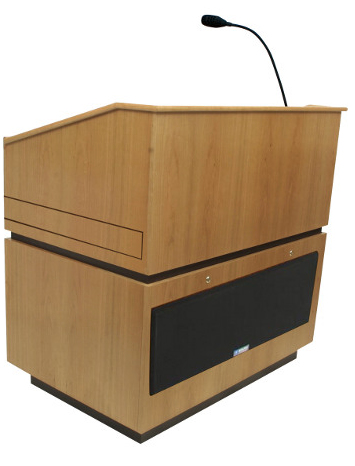 This beautiful solid wood lectern is a fully customizable multimedia presentation podium you can build to suit your needs. With extra large reading surface, huge storage areas with locking doors and a full array of options this lectern will meet your expectations and your multimedia needs.