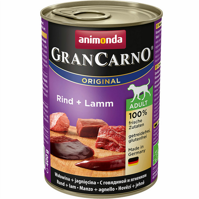 animonda GranCarno Original. Pet food flavor: Beef, Lamb, Capacity: 400 g, Pet life stage: Adult. Energy value (per 100 g): 460 kJ, Protein: 10%, Fat content: 7.5%