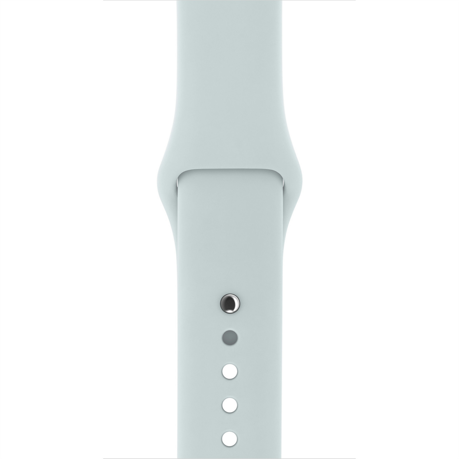 42mm Mist Blue Sport Band, S/M & M/L Made from a custom high-performance fluoroelastomer, the Sport Band is durable and strong, yet surprisingly soft. The smooth, dense material drapes elegantly across your wrist and feels comfortable next to your skin. An innovative pin-and-tuck closure ensures a clean fit.
