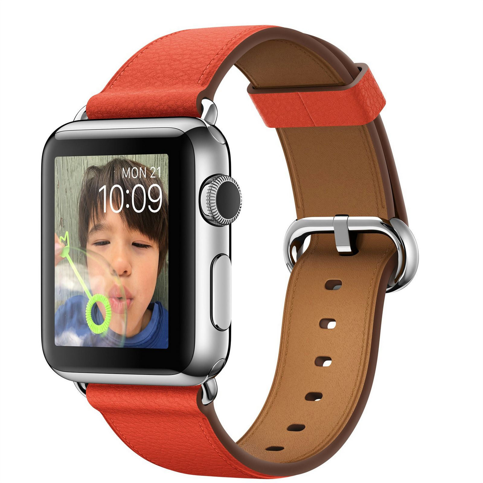 38mm, Retina display, Force Touch, S1, Wi-Fi, Bluetooth, watchOS 2, Stainless Steel Case, Red Classic Buckle