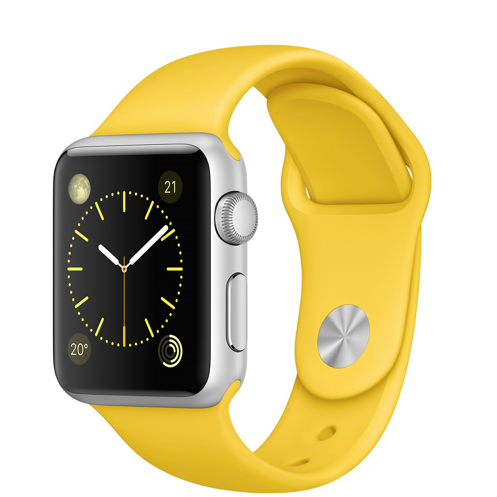 38mm, Retina display, Force Touch, S1, Wi-Fi, Bluetooth, watchOS 2, Silver Aluminium Case, Yellow Sport Band You. At a glance.