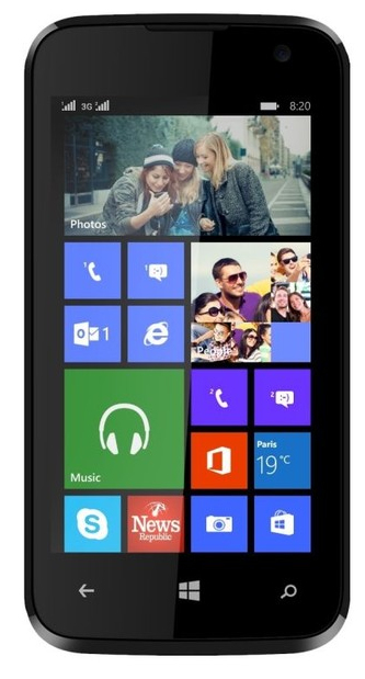 4'' 800 x 480 (WVGA) Capacitive, Qualcomm MSM8212 Quad-Core 1.2 GHz Cortex A7, Adreno 302, RAM 512MB, 4 GB, Micro SD, 0.3 MP/5MP, 3G/UMTS/WCDMA/GSM/GPRS/EDGE, Wifi, Bluetooth 3.0, GPS/A-GPS, Dual-SIM, 1950 mah, Micro USB, 3.5 mm Jack, 126g, 3 Back Casings (Black, Blue, Yellow), Windows 8.1