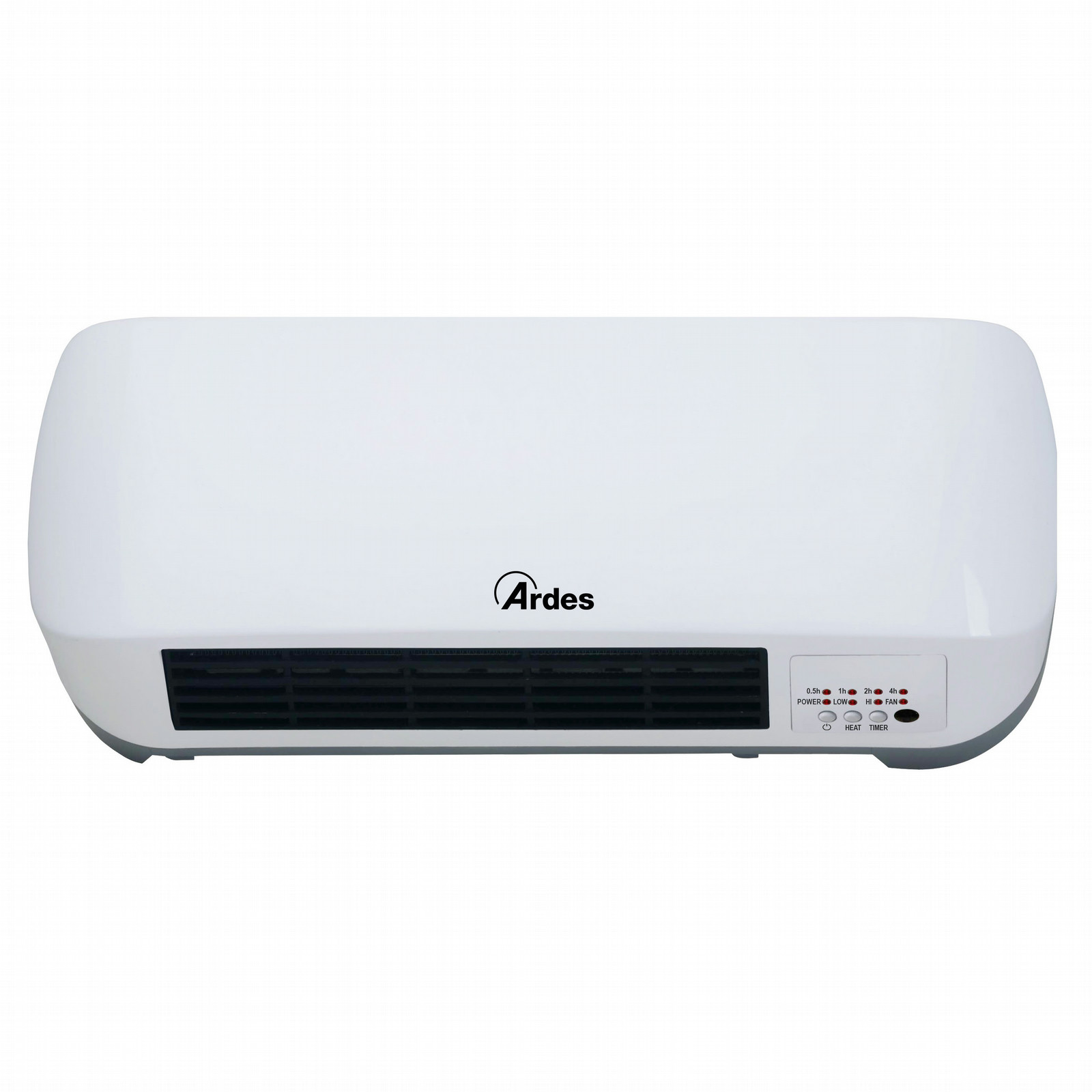 Ceramic fan heater. 2 power settings: eco & comfort. Summer ventilation. Remote control. Timer 7,5 hours. Pilot lamp. Water protection class IPX2. Overheating protection. Product size L50xP12xH19 cm. Power 2000 W. Black/white color. For rooms up to 60 m³.