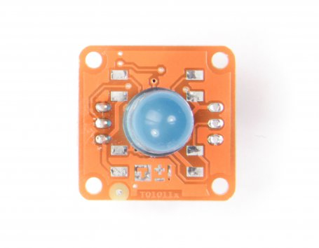 Module description: This module features a 5mm Blue Light Emitting Diode, the standard TinkerKit 3pin connector and a green LED that signals that the module is correctly powered and a tiny yellow LED that shows the current brightness of the blue LED. A resistor provides the optimal amount of current when connected to an Arduino.