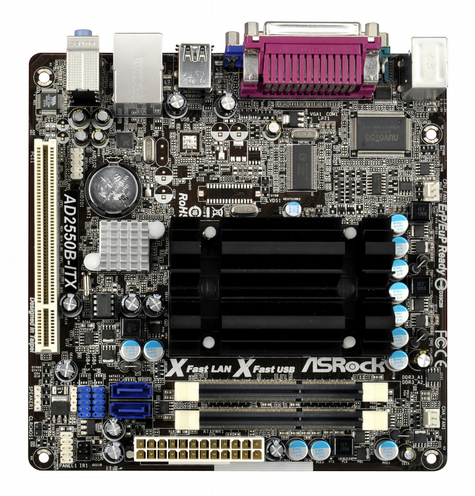 Intel Atom DC D2550, Intel NM10, 2 x DDR3 SO-DIMM, 2 x SATA 3.0Gbps, 1 x PCI, 5.1 ch. HDA, Fast Ethernet, mini ITX