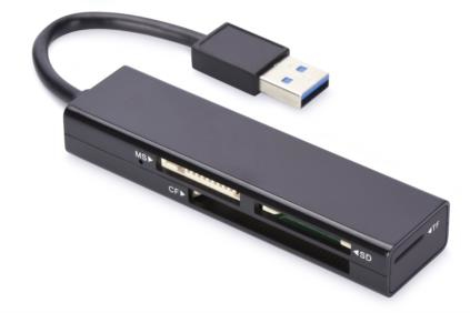 ASSMANN Electronic 85240. Compatible memory cards: CF, Memory Stick (MS), MicroSD (TransFlash), SD, SDHC. Interface type: USB 3.0 (3.1 Gen 1) Type-A. Colour of product: Black. Width: 90 mm, Depth: 24 mm, Height: 13 mm