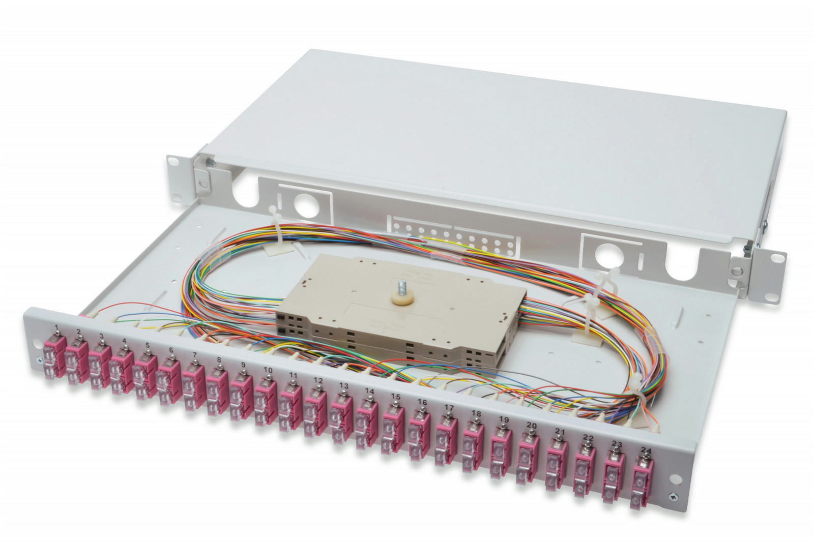 Fiber Optic Sliding Splice Box, 1U, Equipped, 24x SC duplex, incl. M 25 Screw, Splice Cassette OM4 Color Pigtails, Adapter