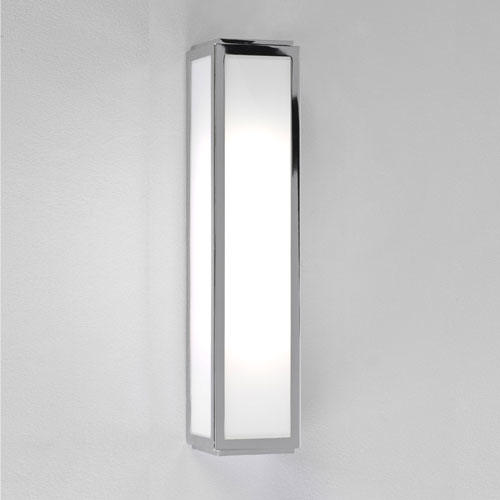 - Mashiko 360 bathroom wall-light. - Polished chrome finish, white glass diffuser. - Uses an 18w 2G11 lamp. - IP44 rated, suitable for bathroom zones 2 and 3. - Class 2, double insulated. - Includes integral electronic ballast.