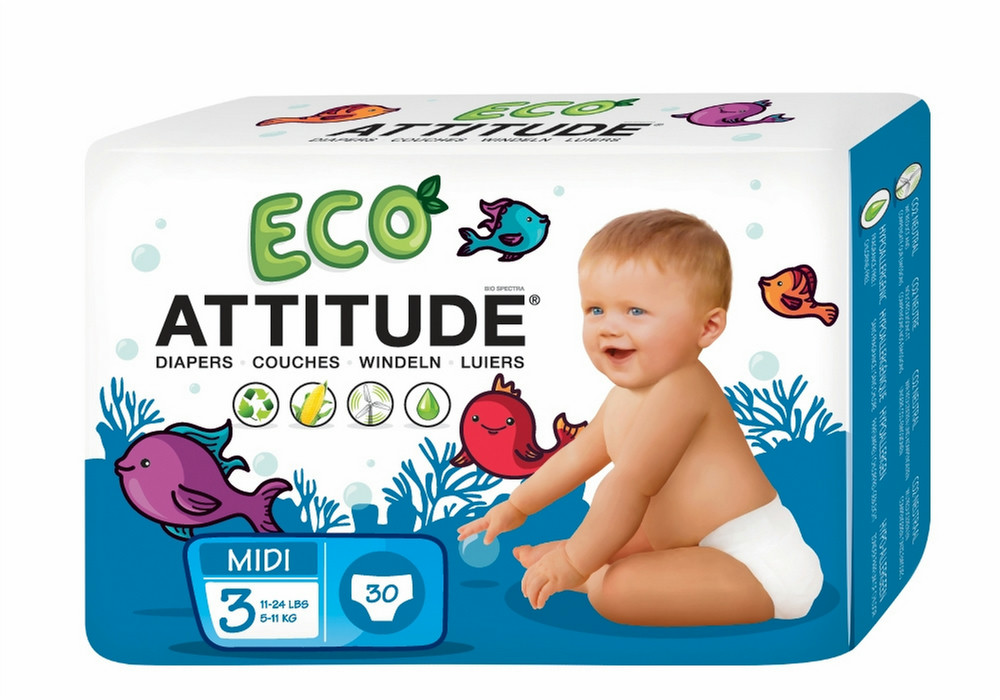 Cloth diapers are fantastic. But life being life, it's not always possible to use them. That's why ATTITUDE baby diapers are there. A true green alternative to traditional disposable diapers, they are as effective, absorbent and comfortable. Made from renewable and biodegradable materials, they are also carbon neutral, which make ATTITUDE baby diapers the greenest disposable diapers in the world! Do it for our planet's future, do it for your baby's future.