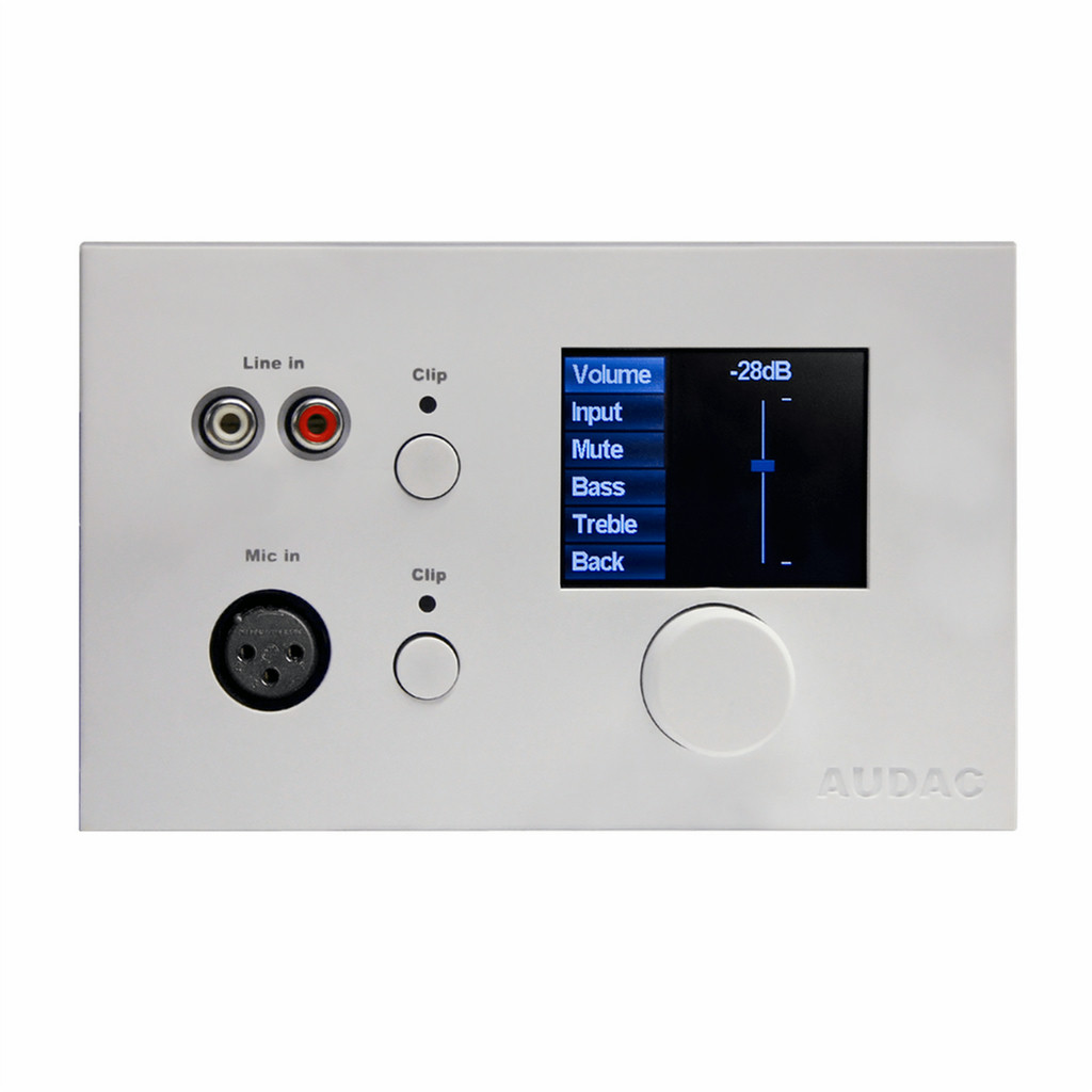 The DW5066 is an all-in-one wall panel controller for multi-zone digital audio matrix systems and multi-media digital audio mixers. It offers various control functions such as audio source selection whereby the routing can be changed or specific mixing presets ('scenes' - only for M2) can be triggered. The control shall be done using the versatile rotatable push dial whereby other settings such as volume, tone control, phantom power, muting, ... also can be made. A local line and microphone level input allows the connection of additional input units to be patched with the matrix / mixer while one of them can also be converted to a local line output. The additional inputs allow connection of a CD-player, MP3 player or any other audio source as local input while a microphone can be connected for making announcements. Both line and microphone audio input can be mixed locally using two push-lock potentiometers and 15V phantom power can be enabled to the microphone input for powering condenser microphones. The audio output function can be very useful in applications where a local audio output is required carrying the same audio signal as one of the direct outputs. This can be very useful for monitoring, recording or other system expansion purposes. A 2.5" graphical LCD display ensures a user-friendly experience for controlling the system and the audio connections are performed using XLR (microphone) and stereo RCA (line) connectors.