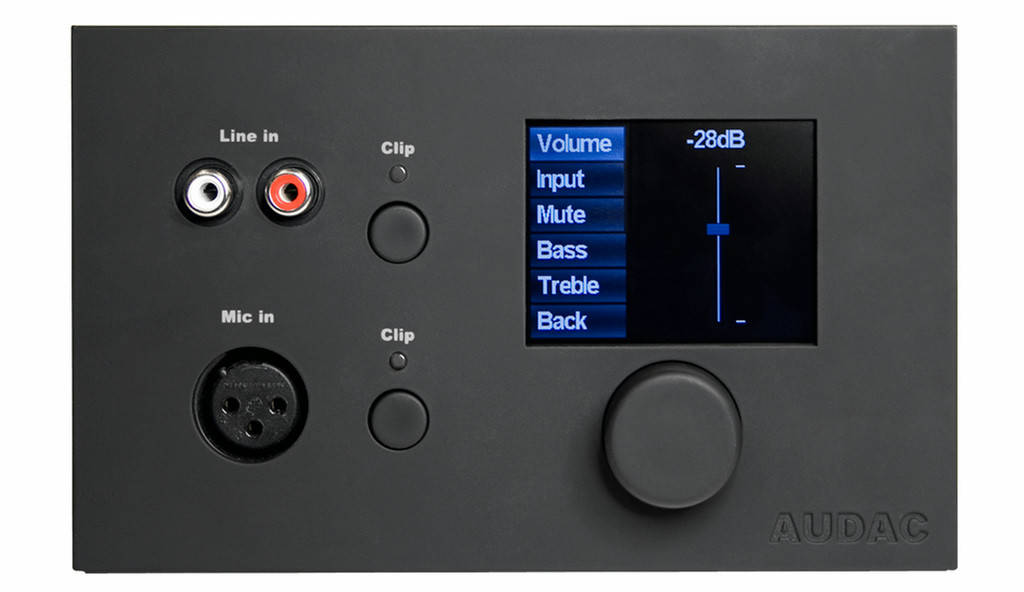 The MWX65 is an all-in-one wall panel controller to be used in combination with the AUDAC MTX series multi-zone audio matrix systems. It can control the input signal and volume for one zone and also contains an additional line and microphone level input which can be patched to the zone it is connected to. Both input selection and volume control as well as two band tone control can be controlled using the versatile rotatable push-dial while the integrated 2.5” graphical display ensures a user friendly experience. An XLR connector is provided as additional microphone input while the line input is performed using RCA connectors. The signals applied to these inputs can be used as one additional local input. This enables you to connect any CD or MP3 player as local music source or connect a microphone for speeches or other announcements. The input mixing can be done by using both push-lock potentiometers. The microphone input has the possibility to provide 15V phantom power which can be turned on and off by software configuration. The wiring between the matrix and the wall panel should be performed by using standard UTP CAT5 cabling which transfers both the control and audio signals to the matrix while providing the power supply for the wall panel.