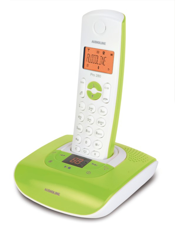 Audioline PRO 280 COLOR. Type: DECT telephone, Recording time: 15 min, Maximum indoor range: 50 m. Mounting type: Desk, Colour of product: green, White. Languages support: German, English, TUR. Phonebook capacity: 20 entries. Display: LCD, Backlight colour: Orange