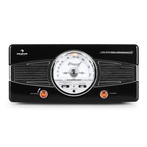 The black-coloured exterior wraps the turntable in a refined casing, elegantly fitting into any living room, kitchen or bedroom while adding a hint of 1950s retro style. In the center is a clearly illuminated display frequency band, which when combined with the chrome speaker covers, immediately transports the viewer back to the times when Cadillacs cruised the streets and James Dean graced the silver screen.