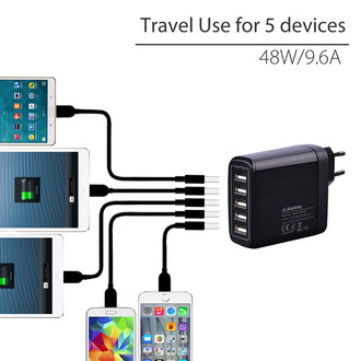 5 USB smart ports, 100-240VAC, 50/60Hz, 9.6A/48W